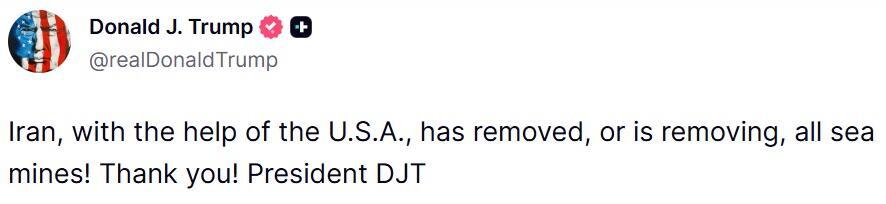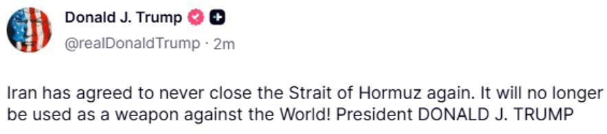"IRAN HAS JUST ANNOUNCED THAT THE STRAIT OF IRAN IS FULLY OPEN AND READY FOR FULL PASSAGE. THANK YOU!"