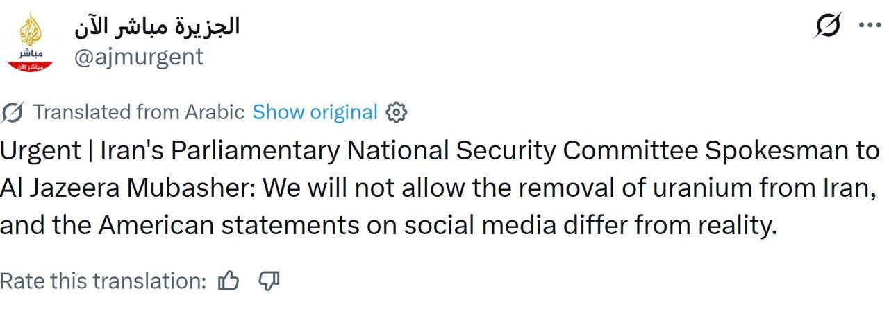 Iranian source in conversation with Al-Arabi Al-Jadeed: Trump's claim about the delivery of Iran's enriched uranium is baseless. Per the report: