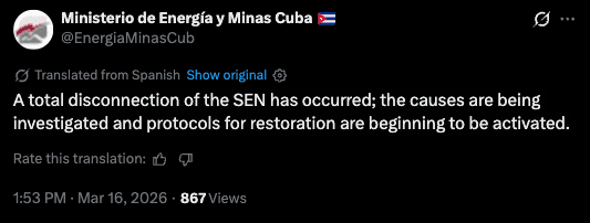 "A total disconnection of the SEN has occurred. The causes are being investigated, and protocols for restoration are being activated," the Energy Ministry said on X around 1400 ET.