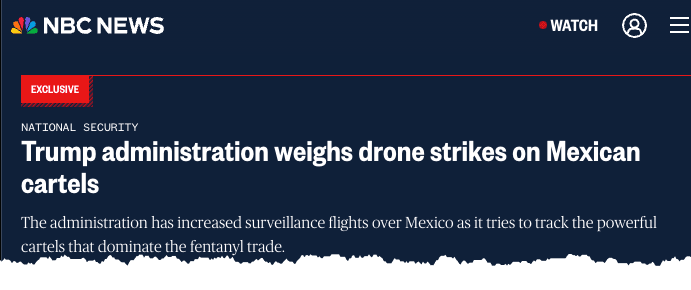 The report cites six current and former U.S. military, law enforcement, and intelligence officials with knowledge of the Trump administration are considering targeted drone strikes against Mexican drug cartels - now designated Foreign Terrorist Organizations (FTOs) and Specially Designated Global Terrorists (SDGTs).