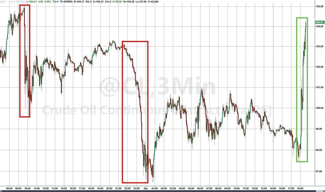Oil had been selling off heading into Trump's address, with traders looking for clearer signals on whether Washington will end the war in the coming weeks, but started to rally strongly as Trump began speaking as traders did not hear the 'mission accomplished' they were hoping for, erasing all of yesterday's ceasefire chatter...