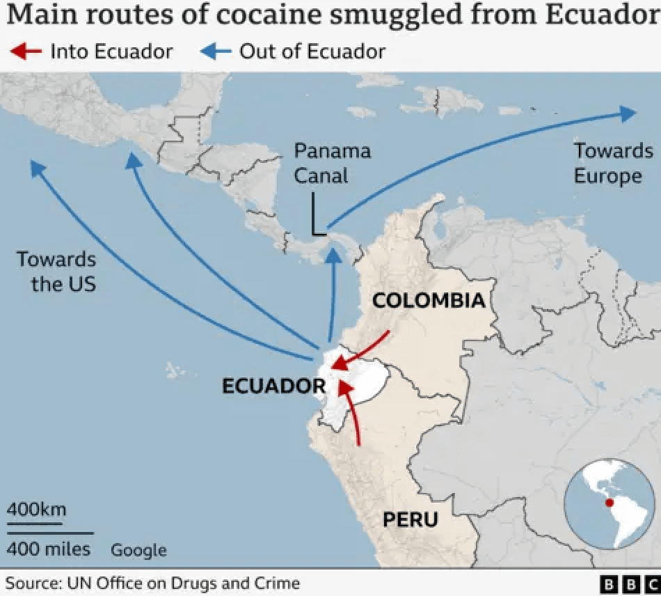 For context, about 70% of the cocaine produced in Colombia and Peru transits Ecuador.
