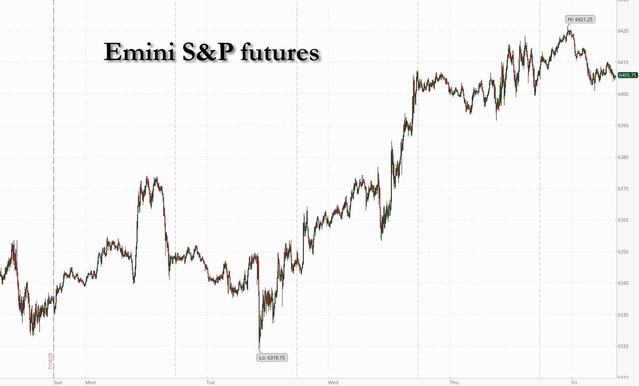 US equity futures are flat at the end of a hectic earnings week and the return of meme traders in force. The market is waiting for next week's trading deluge when nearly 30% of the S&P reports, as well as additional trade deal headlines ahead of the Aug 1 tariff deadline, with focus on a potential 15% tariff rate deal with the EU. As of 8:00am ET S&P and Nasdaq futures are unchanged. Pre-market, megacap tech stocks are mixed with AAPL (+0.4%) leading gains and TSLA lagging (-0.9%); Energy is outperforming. Yields are higher as is the USD; 2-, 5-, 10-, 30-yr yields are 0.49bp, 1.25bp, 1.81bp, 2.69bp higher, with the 10Y tradinbg at 4.41%. Commodities are mixed with oil higher, while base and precious metals are lower. On today's calendar we get the June preliminary durable goods orders (8:30am) and July Kansas City Fed services activity (11am).