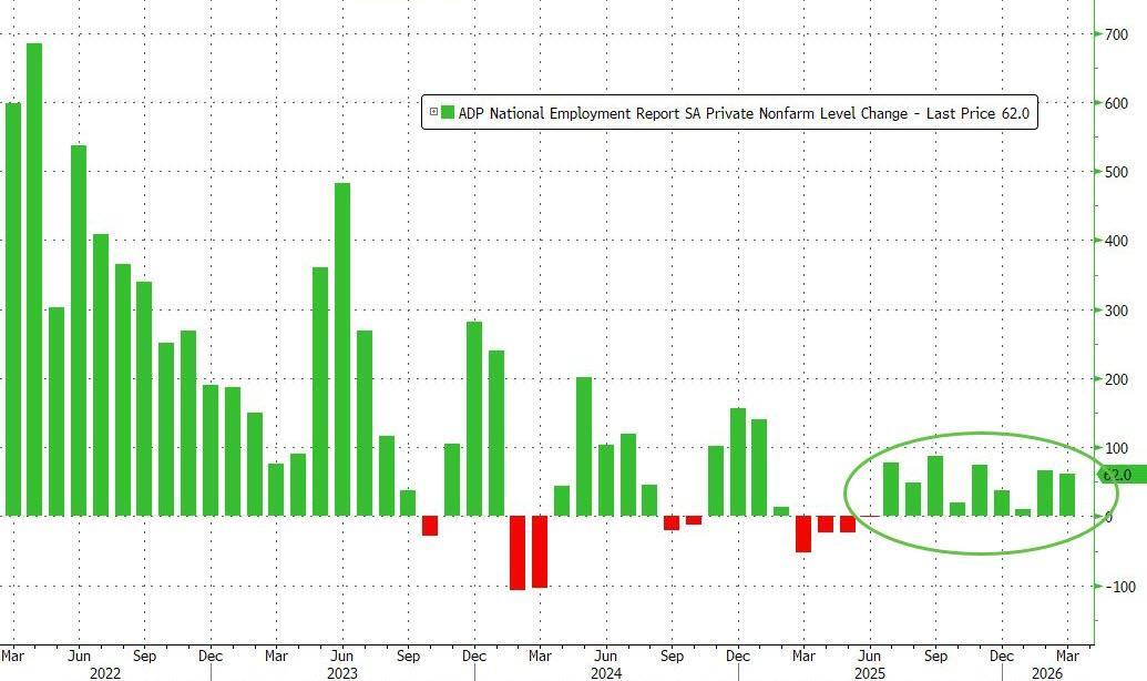 The ADP National Employment report printed a better than expected +62k jobs added in March (+40k exp) and modestly down from an upwardly revised 66k in February.