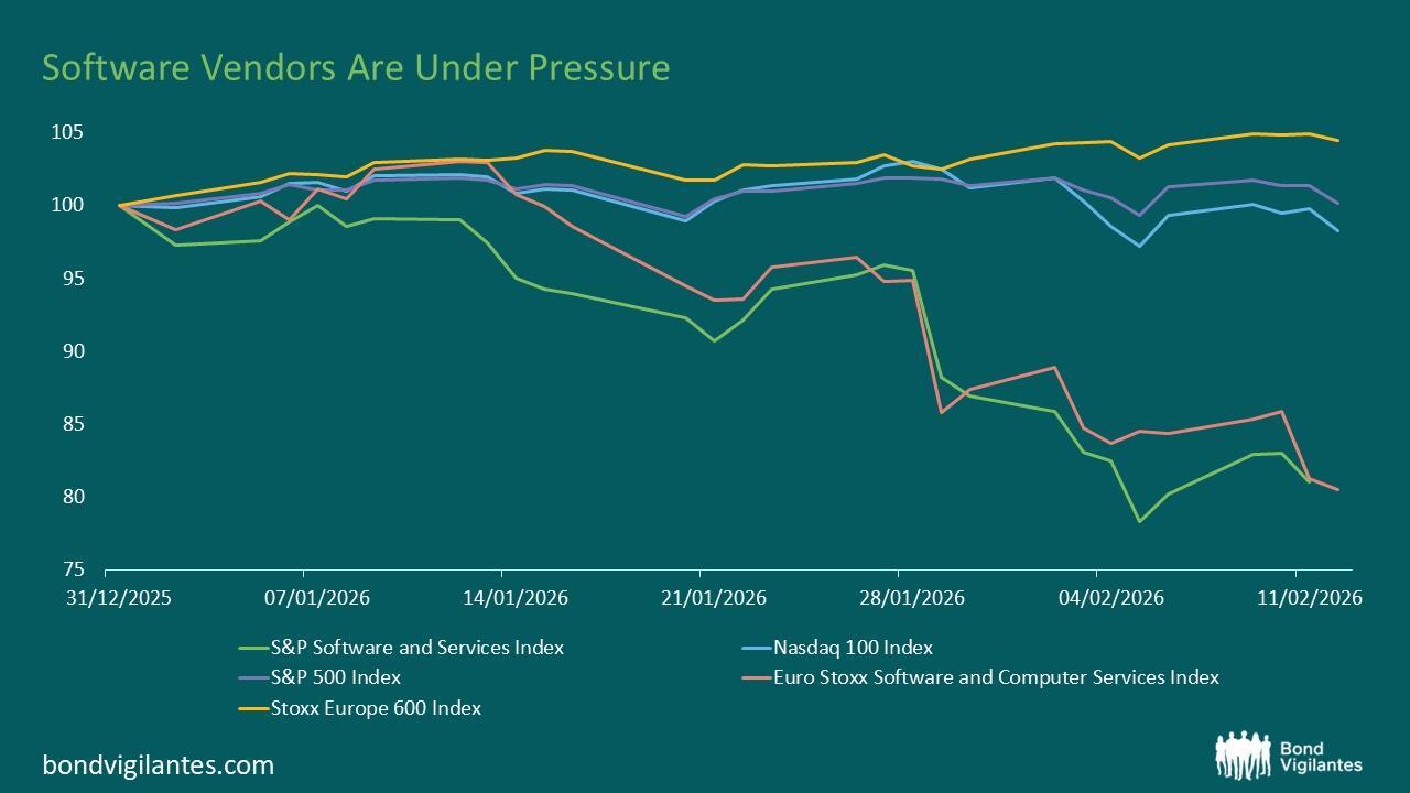 Source: M&G, Bloomberg Indices (Ref. S5SOFWTR, NDX, SPX, SISCSE, SXXP) as at 13 February 2026.