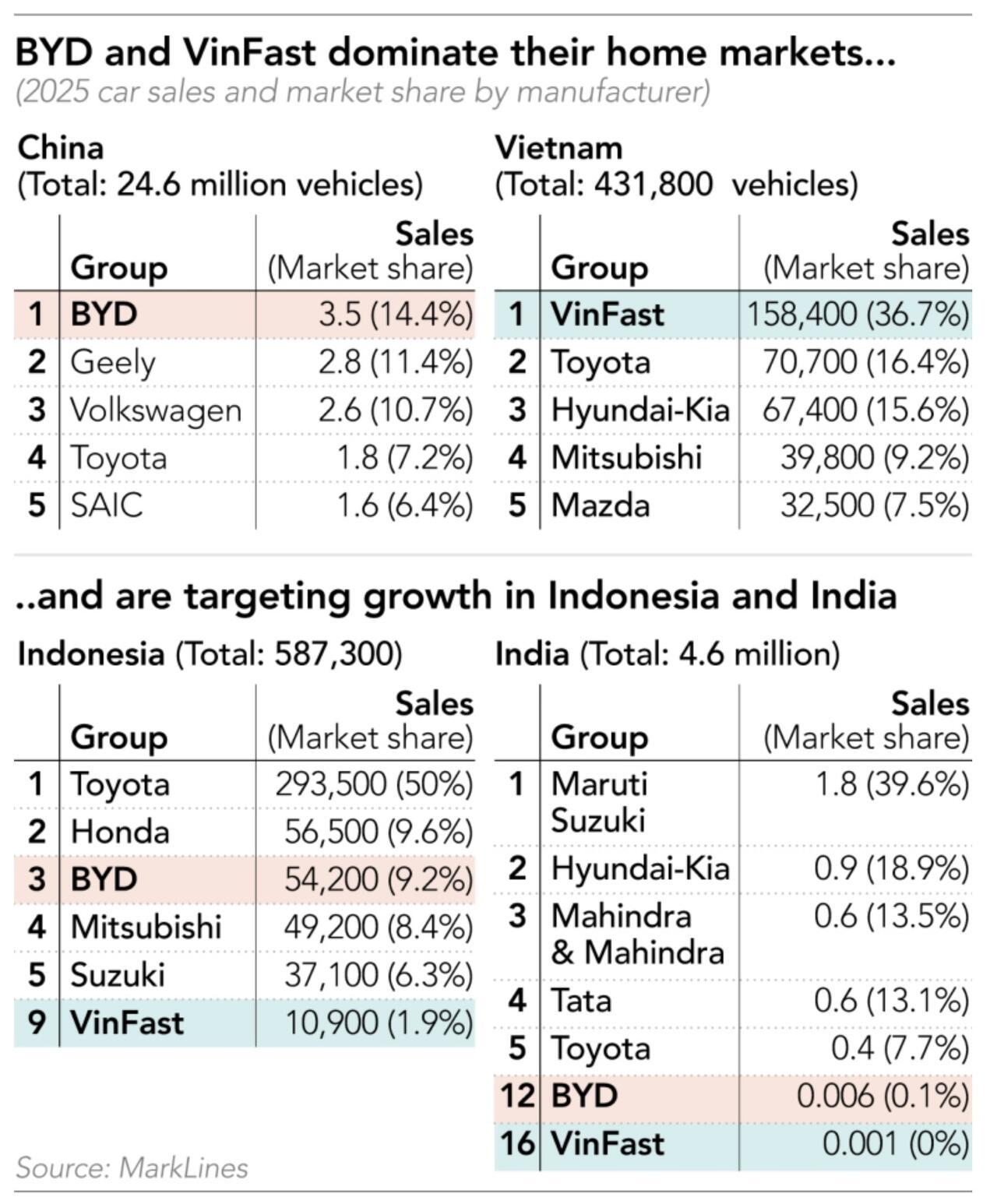 VinFast sold more than 100,000 vehicles across countries including Indonesia, Vietnam, and Thailand, while BYD delivered roughly 70,000 units. Together, they account for around 7% of total vehicle sales in a regional market of approximately 2.4 million cars. Their rapid growth has contributed to a decline in market share for long-dominant Japanese automakers such as Toyota, Honda, and Mitsubishi.