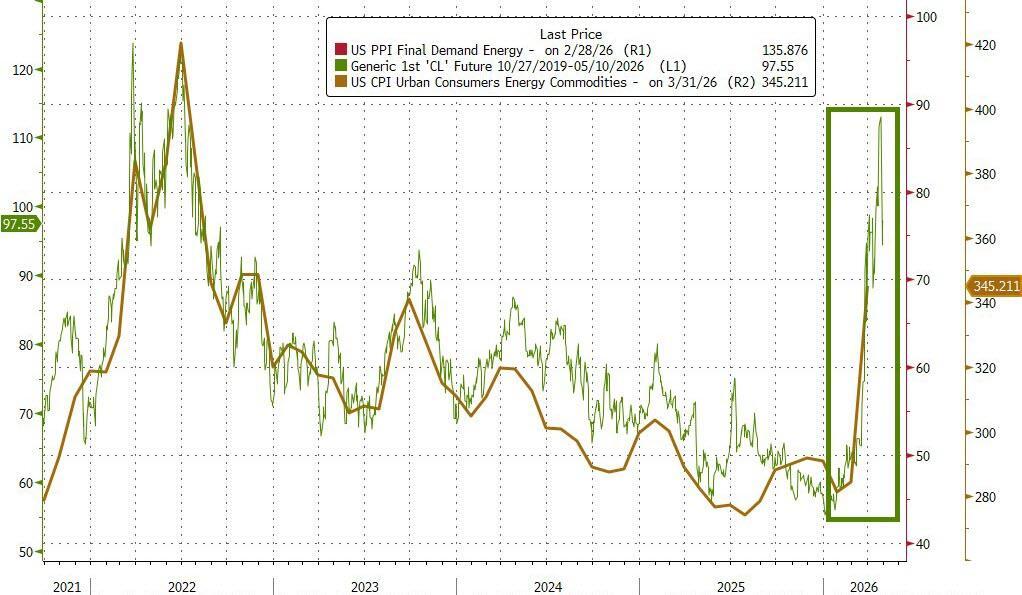 While PCE showed some signs of higher energy prices leaking into inflation prints, it was still February data. As we previewed, today's CPI data is for March and will bear the full brunt of the Iran War's impact on energy costs after Core CPI fell to its lowest in four years in February.