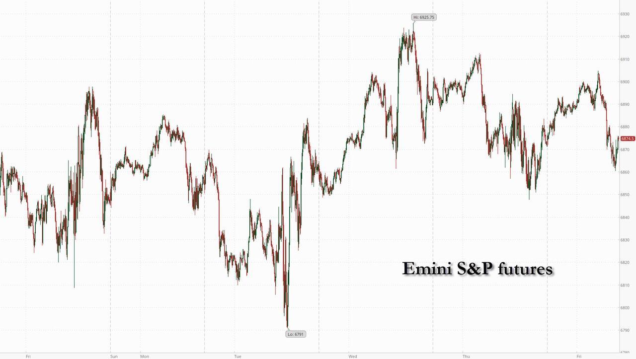 US equity futures are lower, sliding from session highs around the European open to session low just before 8am E as traders assessed the potential market impact of war with Iran, and awaited a firehose of US economic data including GDP and core PCE. As of 8:15am ET, S&P and Nasdaq futures are down 0.1% having traded in the green for much of the overnight session. Pre-market, Mag 7 are mostly red with GOOGL bucking the trend and rising +1.2%. Blue Owl Capital’s shares were set to fall a further 3.5% after its decision to limit withdrawals from a private credit fund. Bond yields have also reversed and are now lower on the session while the USD is flat. Commodities are mixed: base metals are lower while precious metals are rallying, sending gold above $5000 again; Brent crude fell toward $71 a barrel, paring gains since Monday to about 5%. Overnight, a WSJ article rehashed the now familiar story that Trump considers an initial limited strike to force negotiation. Today, key macro focus will be PCE, Flash PMIs and SCOTUS opinion day (markets are waiting for possible decision on IEEPA tariffs).