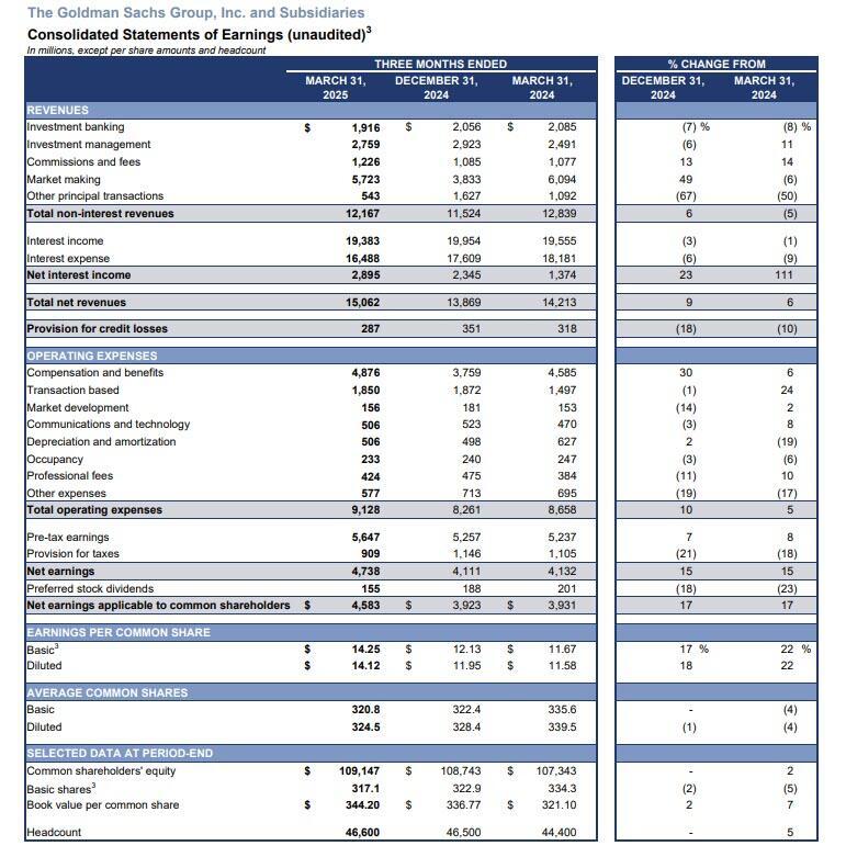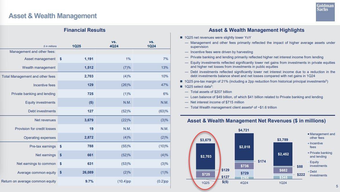 - Net revenues in Equities were $4.19 billion, beating estimates of $3.8 billion, and 27% higher than the first quarter of 2024, "due to significantly higher net revenues in Equities intermediation (primarily reflecting significantly higher net revenues in derivatives) and in Equities financing (primarily reflecting significantly higher net revenues in portfolio financing)."