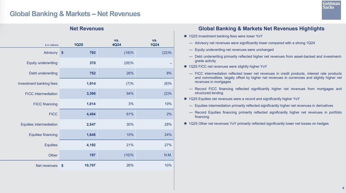 Taking a closer look at the bank's all important Global Banking and Markets division, net revenues were $10.71 billion for the first quarter of 2025, 10% higher than the first quarter of 2024 and 26% higher than the fourth quarter of 2024. At the same time, growth in Goldman’s dealmaking machine remains challenged as the same market volatility that fuels trading hampers clients’ willingness to ink big-ticket mergers and financing agreements. The company’s investment-banking revenue was $1.91 billion, 8% lower than last year. Financial-advisory revenues and equity underwriting both missed expectations, but the bank’s debt desk came in higher than predicted. here are the deails: