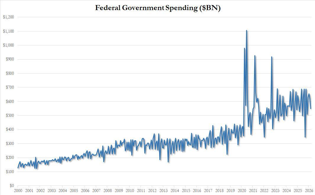 On a cumulative basis, six months into fiscal 2026 (which ends in September), the US budget deficit was $1.169 trillion, down about 11% from the $1.307 trillion accrued through this point in 2025. Aside from the crisis 2021 year, this was the third biggest cumulative budget deficit in US history half-way into the fiscal year.
