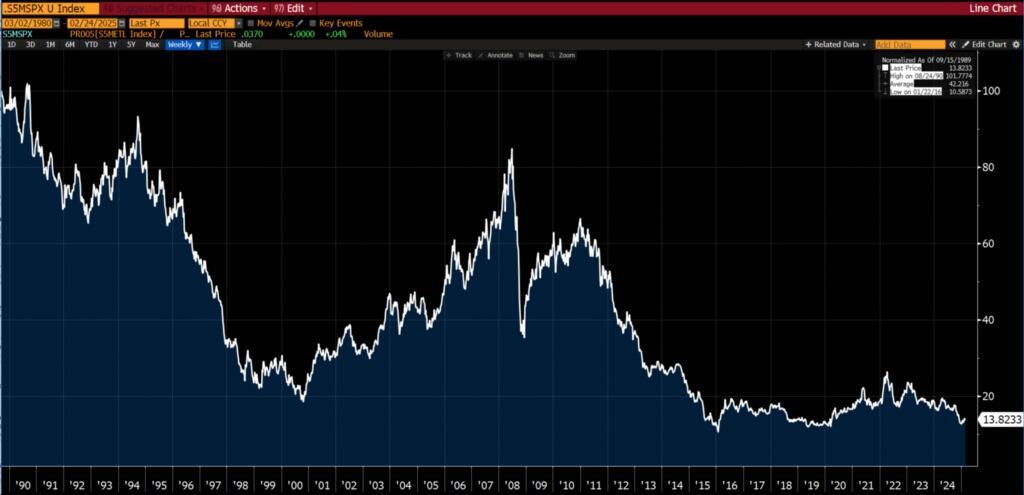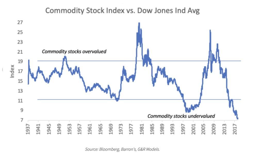 Taking the last 35 years, commodities relative to equities are as toxic as they were in the late 1990s. We remember that time. No one wanted to touch them with a 40-foot barge pole, least of all commodity sensitive stocks.