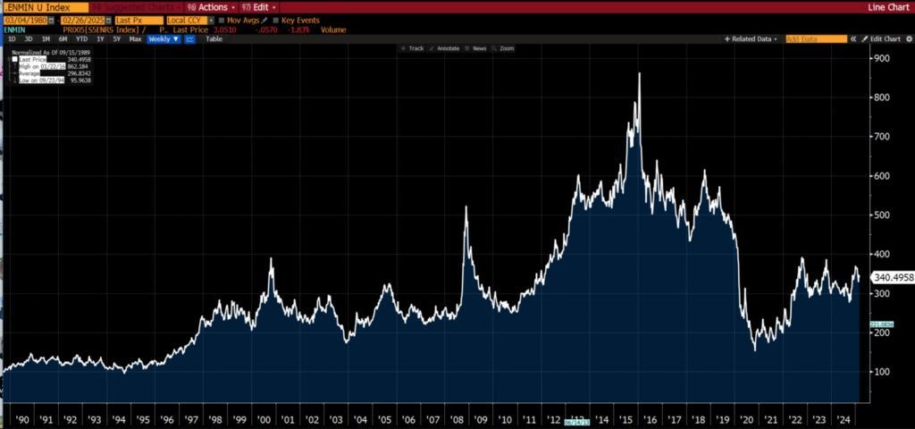 S&P 500 Energy Index (XLE) vs S&P Metals and Mining (XME), both indexed to 100