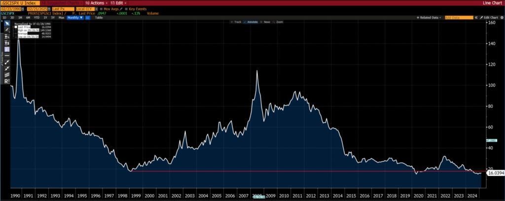 To round it all off, taking the S&P GSCI (the Goldman Commodity Index) as a proxy for the commodity sector (only because it has the longest history)…