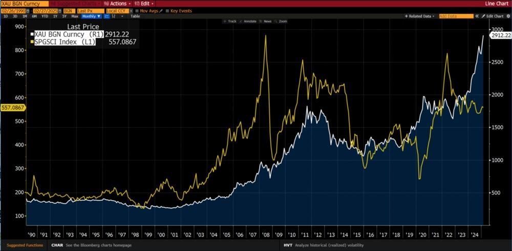 Notice the gap that has opened up between gold and commodity prices? We believe it will close by commodity prices rising to play catchup with gold.