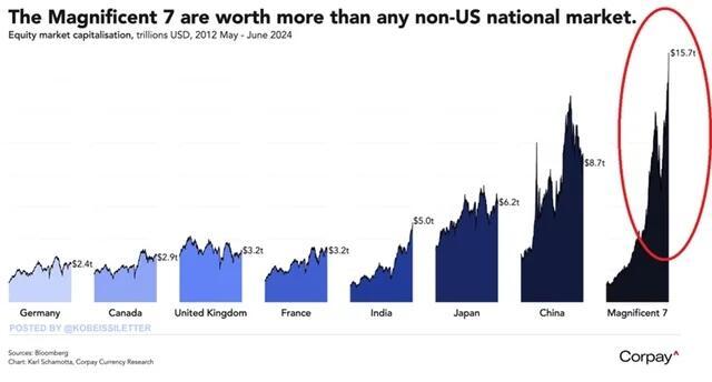 The Magnificent 7 now account for an eye watering 25% of the market cap of the world stock market (MSCI World).