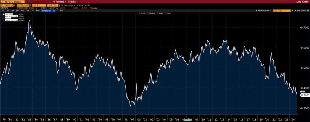 Russell 2000 Index vs S&P 500, both indexed to 100