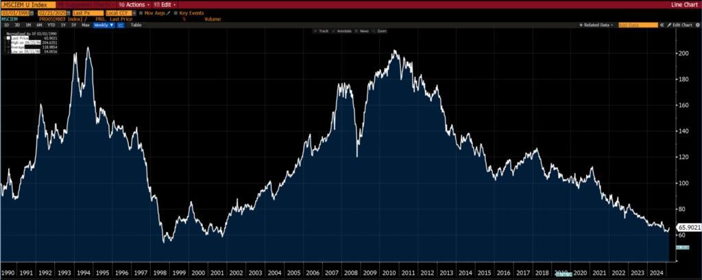 MSCI Emerging Markets vs MSCI World, both indexed to 100