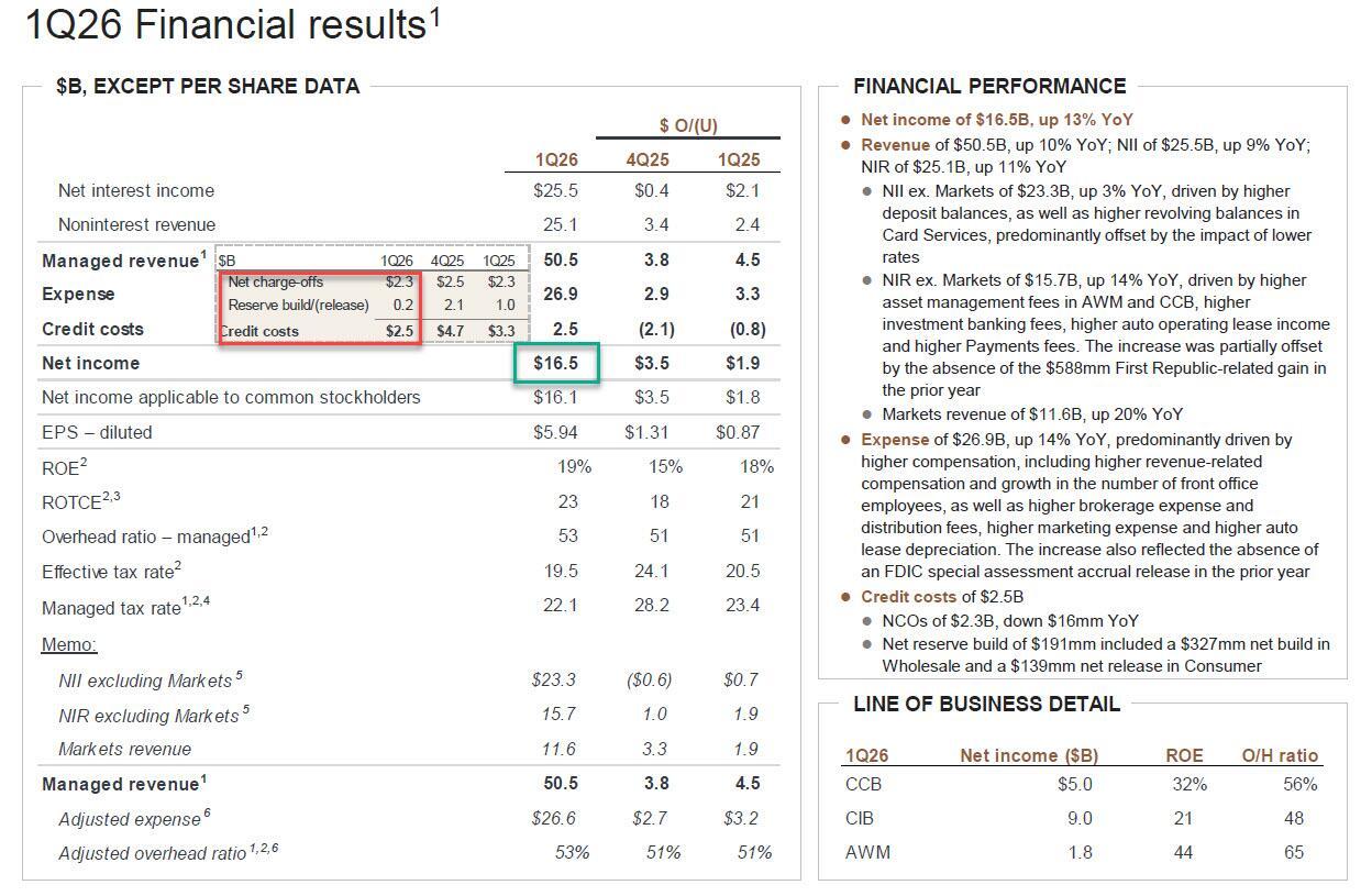 Of note, JPMorgan increased the reserves set aside for potentially soured loans by only $191 million in the first quarter, less than analysts expected. That included a net build for the wholesale side, partially offset by a net release in consumer. With JPMorgan's net charge offs coming in below estimates, it appears that JPM was positioned well for the ongoing private credit meltdown.