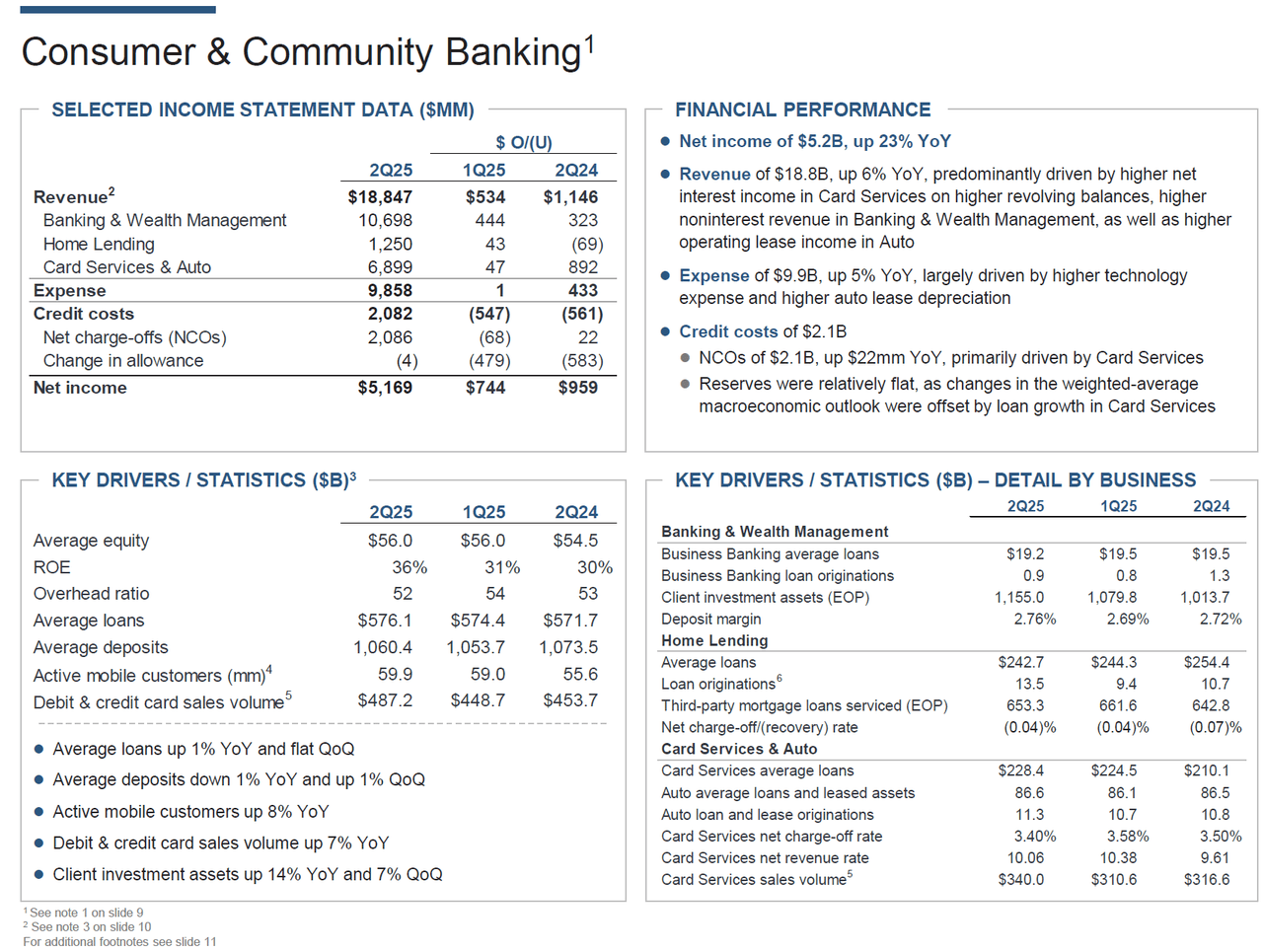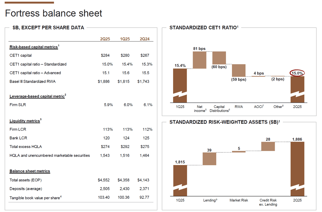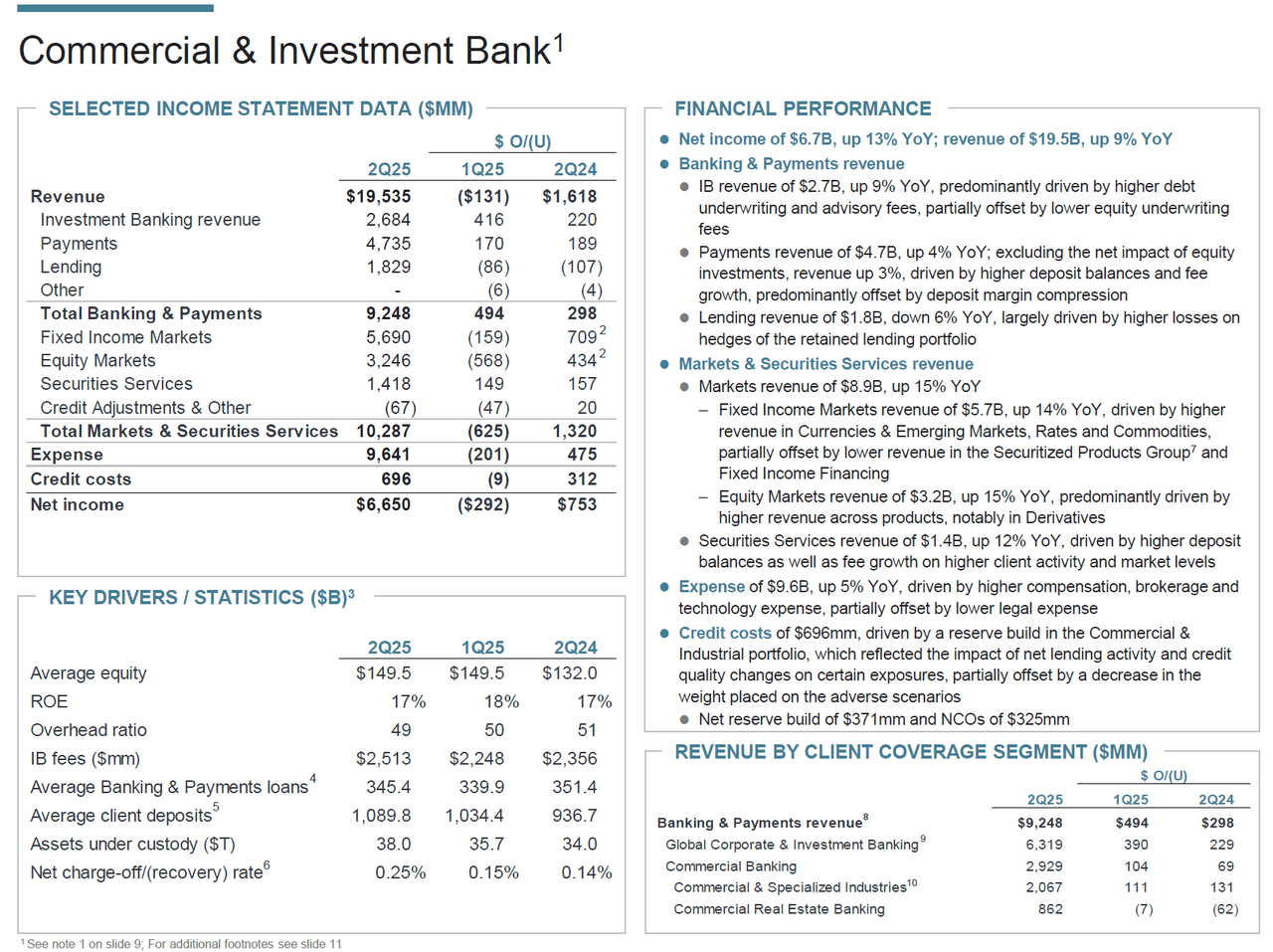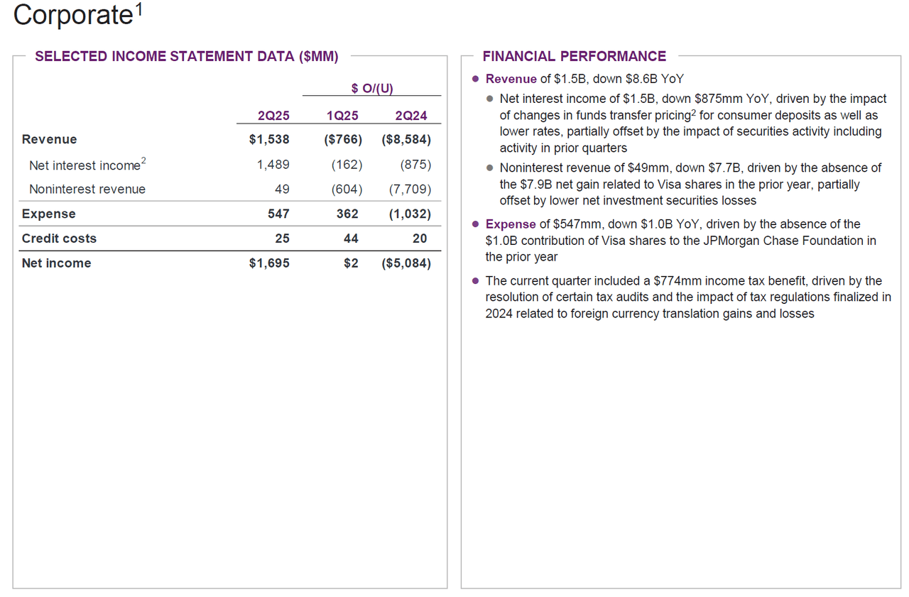 The effective tax rate for the company was 18.0%, below the 21.3% managed tax rate. This is notable because the bank discussed a “significant item” which appears to be an income tax benefit that represents $774 million of net income (and $0.28 of earnings per share). Some more from a footnote: “Second-quarter 2025 net income, earnings per share and ROTCE excluding the $774mm income tax benefit are non-GAAP financial measures. Excluding this item resulted in a decrease of $774mm (after tax) to reported net income from $15.0B to $14.2B; a decrease of $0.28 per share to reported EPS from $5.24 to $4.96; and a decrease of 1% to ROTCE from 21% to 20%. Management believes these measures provide useful information to investors and analysts in assessing the firm’s results.”