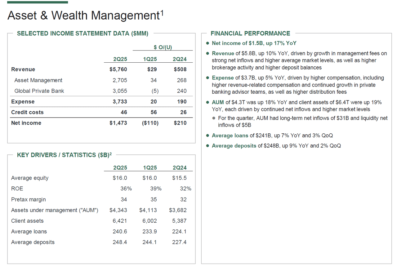 Taking a quick look at the bank’s asset and wealth management division, the group generated $1.5 billion of net income up 17% compared to a year ago as net revenue was up 10% to $5.8 billion, “driven by growth in management fees on strong net inflows and higher average market levels, as well as higher brokerage activity and higher deposit balances.” Assets under management were up 18% to $4.3 trillion and client assets were up 19% to $6.4 trillion, “driven by continued net inflows and higher market levels.” And yet $3.7 billion of noninterest expense was up 5%, “driven by higher compensation, including higher revenue-related compensation and continued growth in private banking advisor teams, as well as higher distribution fees.”