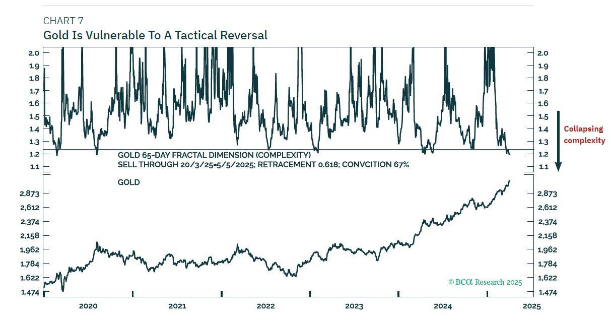 A relief rally in the dollar also implies a tactical reversal in gold, which is confirmed by gold’s 65-day price complexity reaching the point of collapse that has signalled previous tactical reversals (Chart 7).
