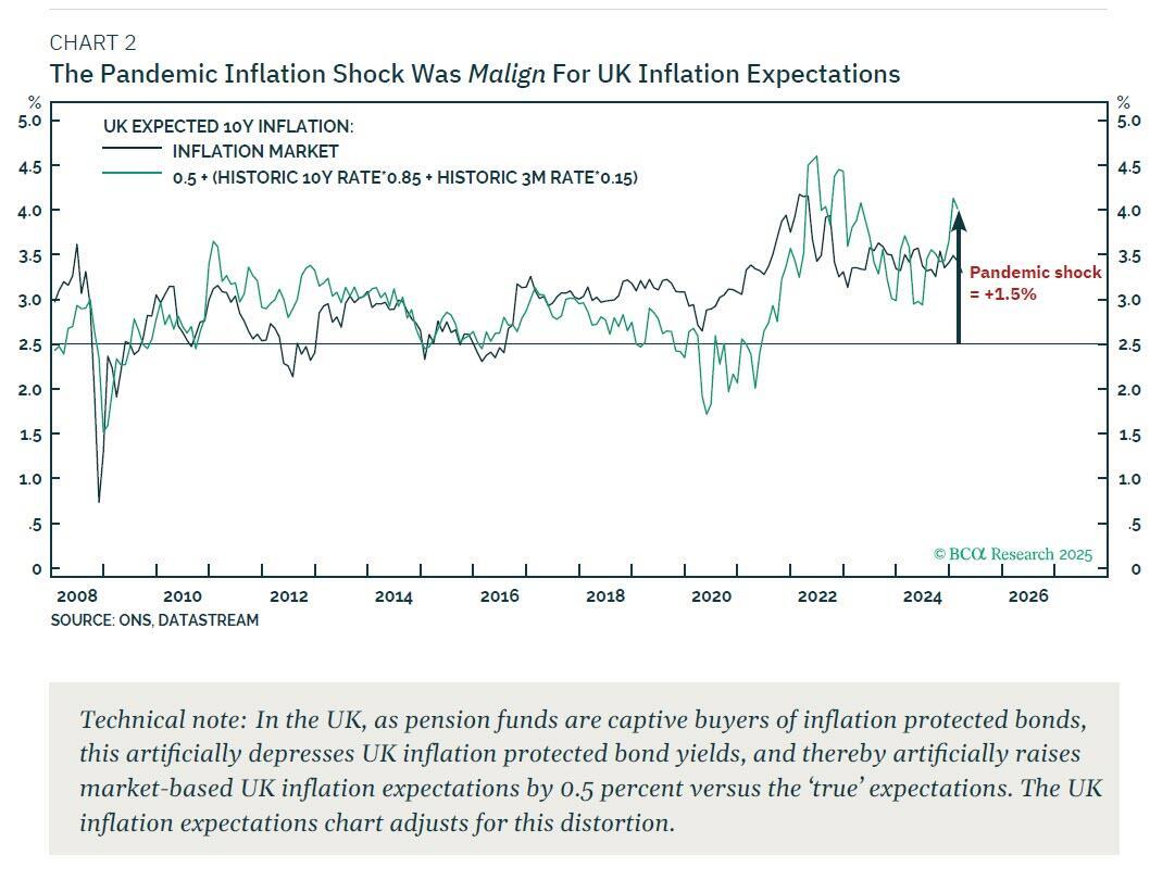 But in the US and the UK, where long-term inflation expectations were close to 2 percent, the pandemic inflation shock as malign – because it lifted those structural inflation expectations to well above the 2 percent threshold at which inflation becomes perceptible.