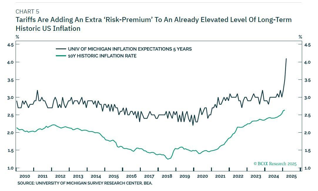 Tariffs will only make matters worse, as it will add an extra ‘risk-premium’ to an already elevated level of long-term historic US and UK inflation (Chart 5).