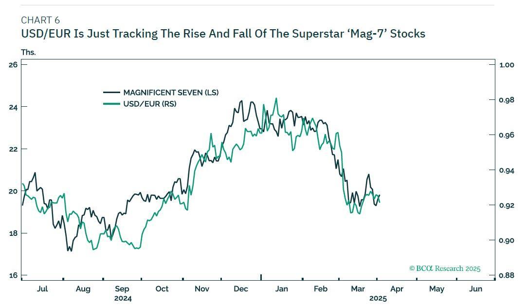 The FX markets are more complicated because they will also be influenced by capital flows into and out of risk-assets. Specifically, USD/EUR is just tracking the rise and fall of the superstar ‘Mag-7’ stocks (Chart 6).