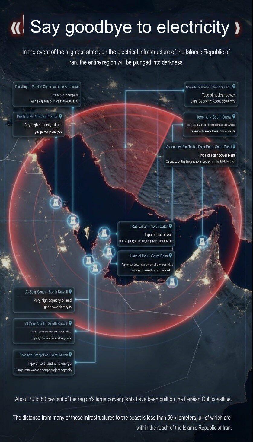 Iran’s IRGC-affiliated Mehr news wrote: "In case of the slightest attack on the electricity infrastructure of the Islamic Republic of Iran, the entire region will go dark." Here's the target list it shared: