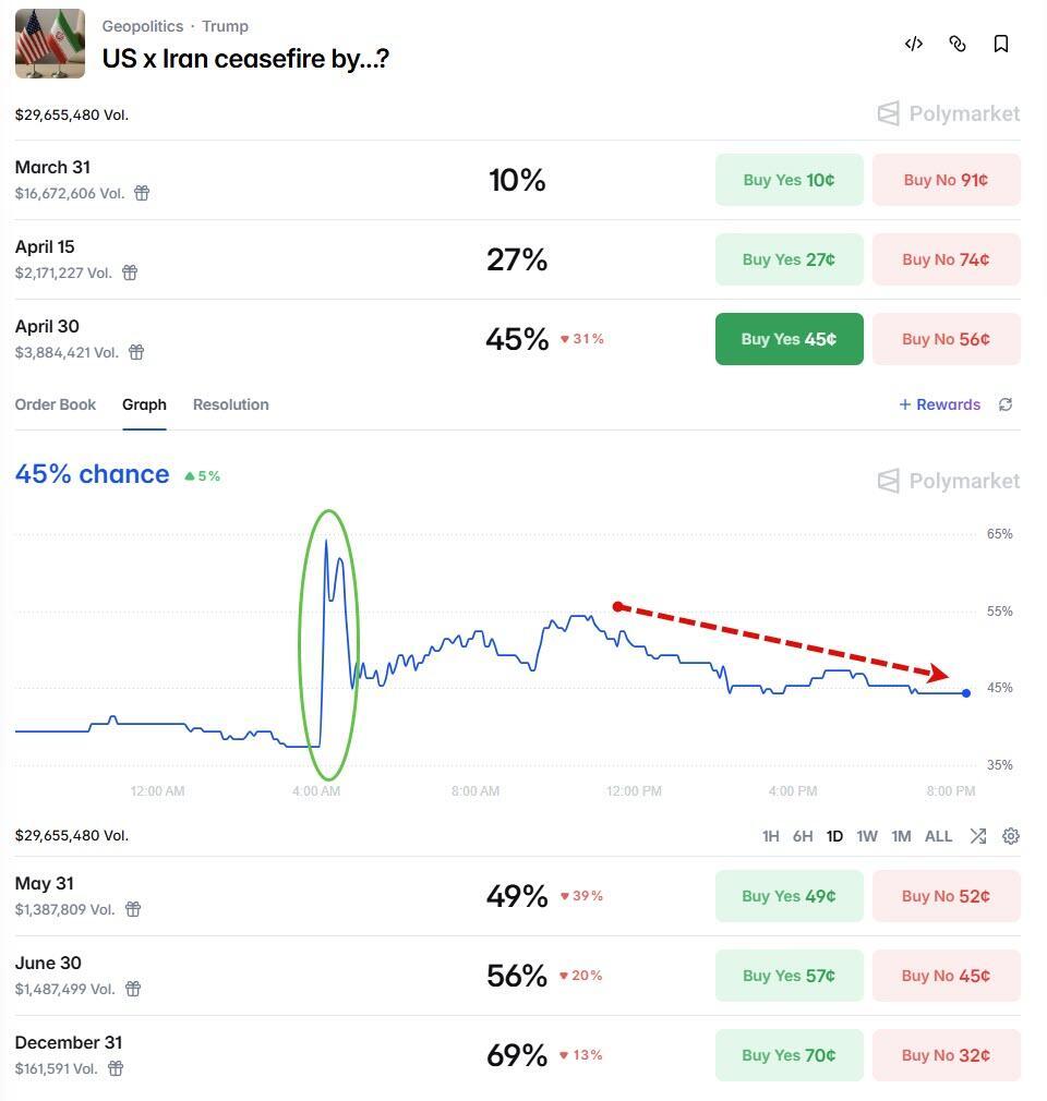 The prediction market odds of a ceasefire by April 30th surged above 65% initially but have faded since, back below 50%...