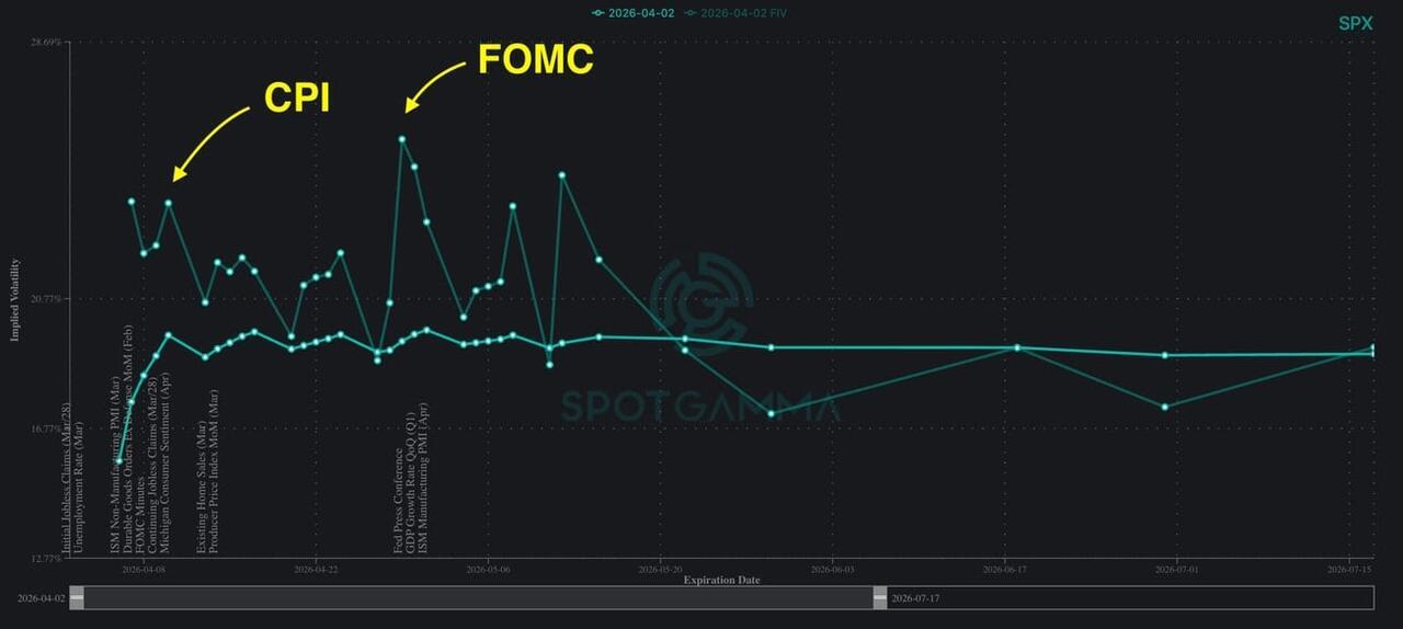 Comparing that curve with Forward IV shows a meaningful spread around both the CPI and FOMC dates, suggesting current positioning may not fully reflect the event risk those catalysts could bring. Between negative gamma, the IV-RV flip, and a still-steepened vol curve, the data suggests traders should remain alert.