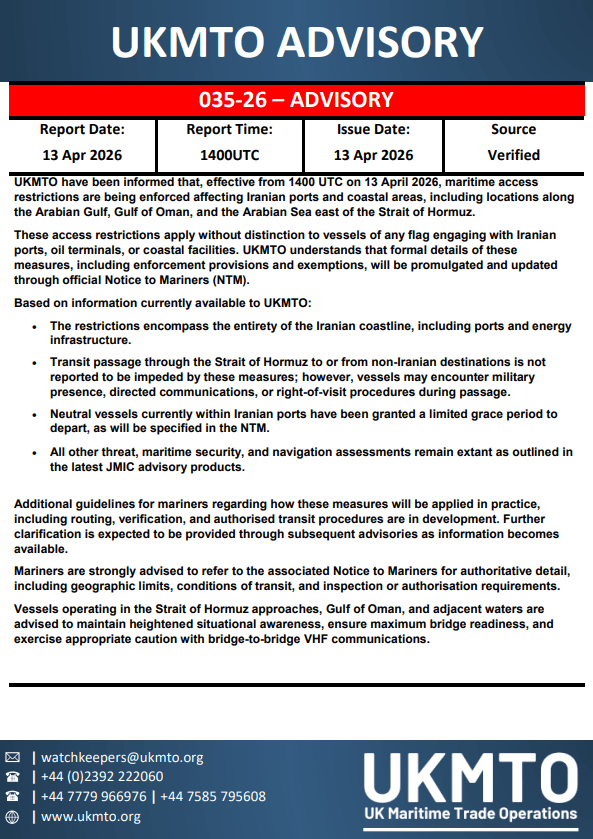 The UK Maritime Trade Operations also confirmed that the U.S. Navy is actively conducting enforcement operations as part of its blockade on Iranian ports and coastal areas.