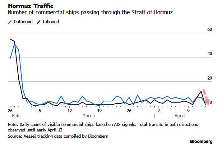 One day after a burst of traffic through the Strait of Hormuz, when according to Bloomberg 19 ships crossed in either direction while Trump said that as many as 34 ships crossed the waterway on Sunday, shipping through Hormuz slumped back down again Monday, reversing Sunday's jump, as caution mounted ahead of a US naval blockade.