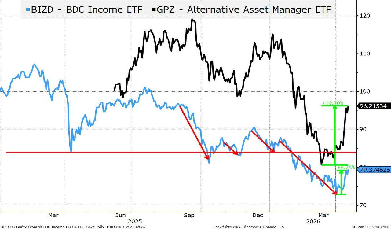 We use BIZD to reflect BDCs more broadly. It has risen “only” 9% since April 1st and despite the rally is still below its post-Liberation Day lows.