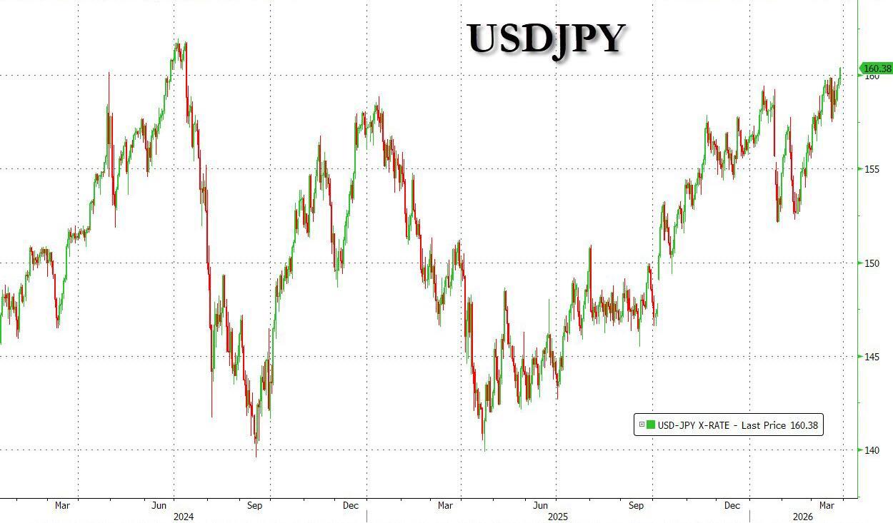 With the yen collapse accelerating, and pushing the USDJPY above 160 for the first time since 2024, markets are on edge expecting a BOJ intervention at any moment as this was the price when the BOJ intervened last time.