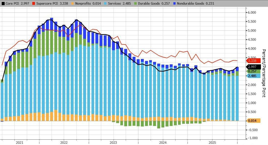 The Fed's favorite inflation indicator - Core PCE (a measure of price changes in consumer goods and services that excludes volatile food and energy costs) - rose 0.4% in December (the latest data released today), slightly hotter than expected (+0.3% MoM). That lifted YoY inflation up 3.0% (above the prior month and hotter than expected) - the highest since April 2025...