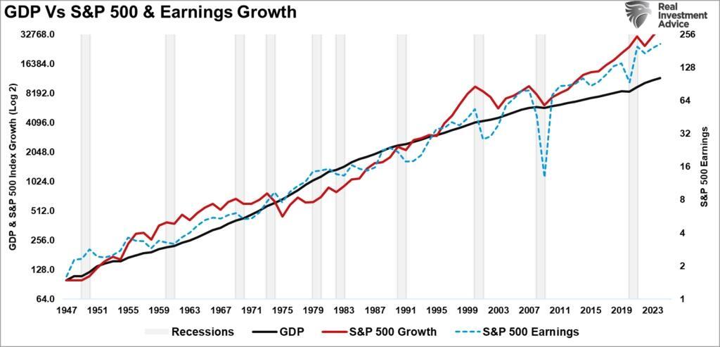 Why is this important? The chart below notes that when markets and earnings significantly deviate from the long-term growth trend of the economy, they revert to the economy—not the other way around. However, not every reversion is linked to a recession.