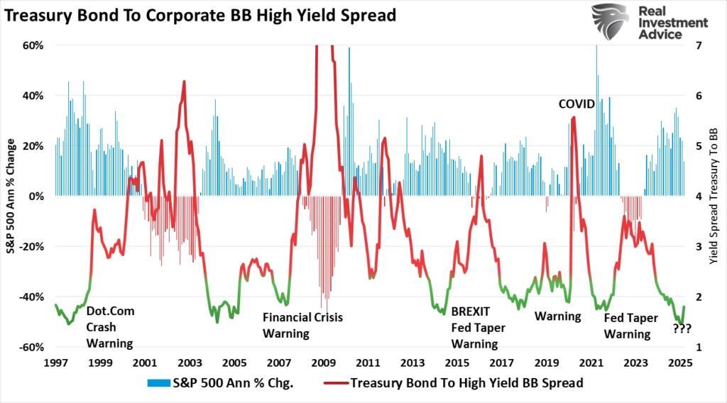 However, the most crucial indicator we watch is credit spreads. Credit spreads are the market’s early warning indicators if a correction will morph into a recessionary bear market. To wit:
