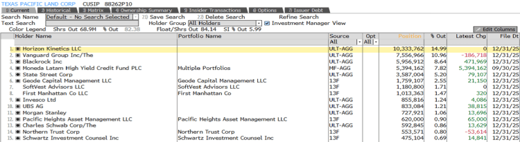 Bloomberg data show that Horizon Kinetics is TPL's largest shareholder, owning 10.3 million shares, or about 14.99% of the tradable shares outstanding.