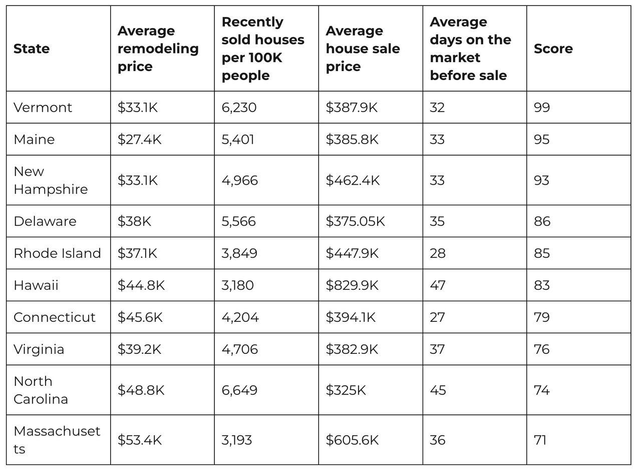 Vermont tops the list of best states for house flipping with a score of 99, thanks to fast sales (32 days on market) and high transaction volume. Maine follows with a score of 95, offering the lowest remodeling costs ($27,486) among top states and similarly quick sales, the study from Badeloft shows.