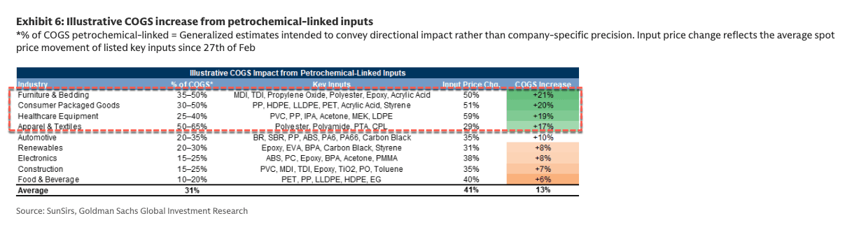 Goldman analysts warned that the petrochemical supply shock sweeping across Asia is now morphing into a full-blown COGS shock, hitting a range of industries with factories across the region. The immediate consequence is that manufacturers - from sofa makers to apparel producers - are being forced to dial back production and, in some cases, idle plants altogether as soaring petrochemical-linked input costs drive up the price of plastics and other key materials.