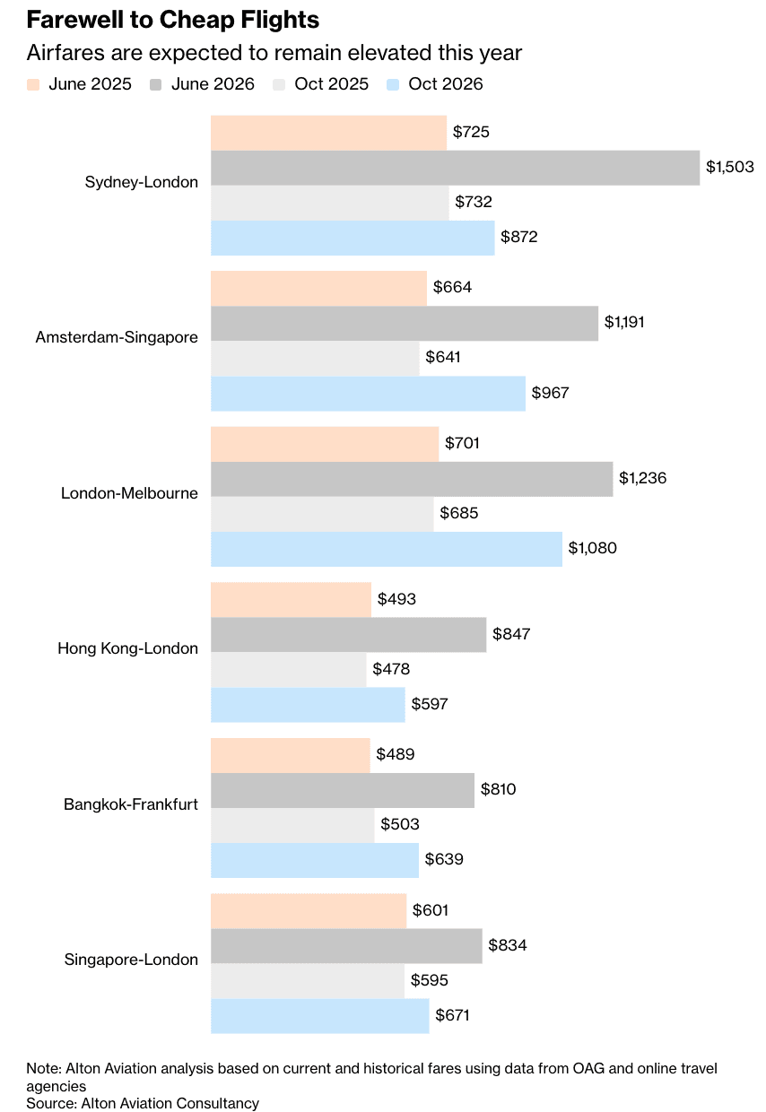 In a separate report, Bloomberg cited data from research firm Alton Aviation showing that long-haul summer airfares have surged. In particular, June fares on key Asia-Pacific-to-Europe routes are up 70% from a year ago, with some routes experiencing even steeper increases: Hong Kong to London, up 560%; Bangkok to Frankfurt, up 505%; and Sydney to London, up 429%.