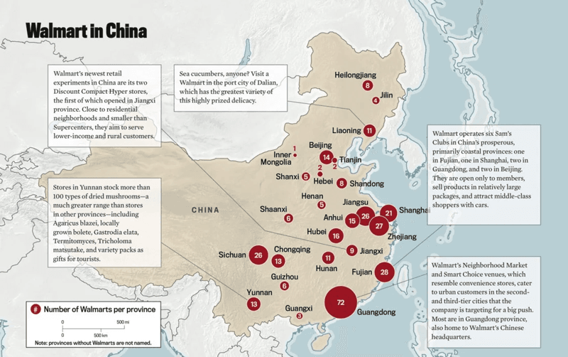As of 2024, Walmart operated nearly 400 retail stores and clubs across more than 100 cities in China, supported by almost two dozen distribution centers. In the most recent quarter, Walmart reported a 28% net sales growth in the country.