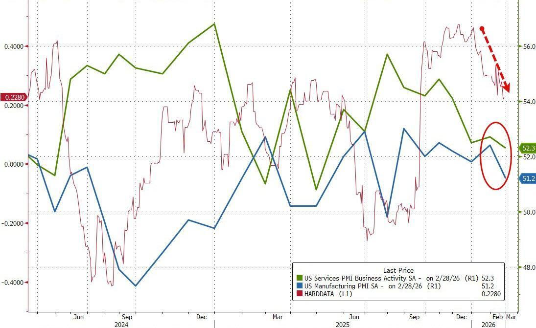 While 'hard' data has been fading modestly in recent weeks, 'soft' survey data has bounced back but today we get a first glimpse at February's PMIs from S&P Global to see if that survey-based confidence is continuing.