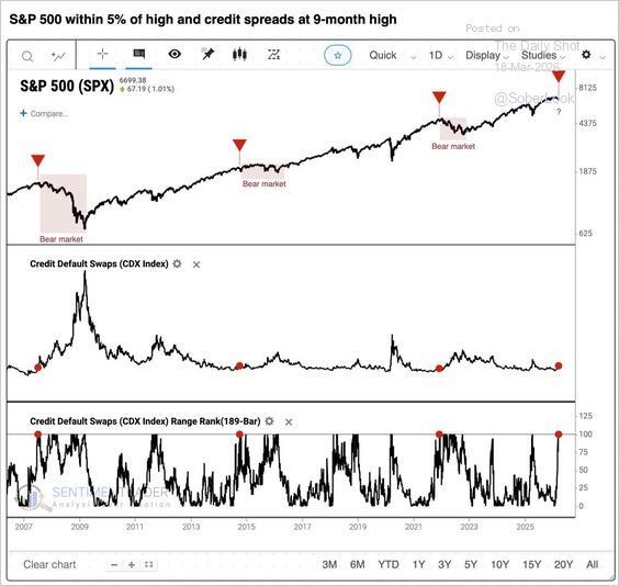 The chart from Sentiment Trader below tells the story as clearly as any amount of prose could. The top panel tracks the S&P 500 since 2007. The middle panel shows the CDX Index of credit default swaps. The bottom panel shows where those spreads stand relative to their 189-bar range, essentially a percentile reading of how elevated they are relative to recent history. (Red markers indicate instances where CDX spreads hit 9-month highs while the S&P 500 is within 5% of its high.)