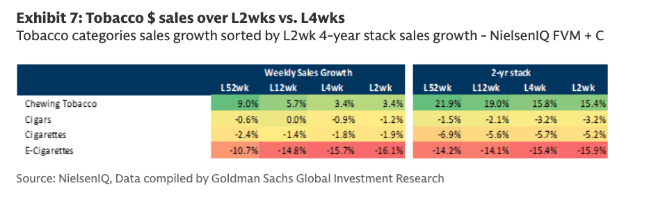 Even before the assessment was released, NielsenIQ data showed e-cigarette sales in the U.S. were weak as of March 21 (according to the Goldman report, which can be viewed in full here for Pro subscribers):