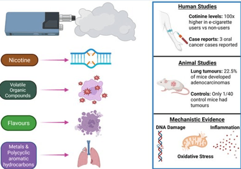 Researchers examined human studies, animal experiments, and lab tests. Together, they found signs that vaping can damage DNA, cause inflammation and oxidative stress, and expose users to harmful chemicals considered drivers of cancer. Some rodent studies also found lung tumors after vape exposure.