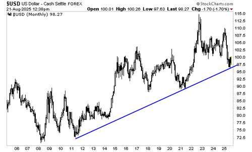 This is especially true as the $USD is on the verge of a MAJOR breakdown. I’ve shown this chart before. There’s a reason I’m showing it again: this is the SINGLE most important chart in our financial system today. When the $USD takes out that trendline, it will enter a secular bear market. And this will ignite an inflationary storm.