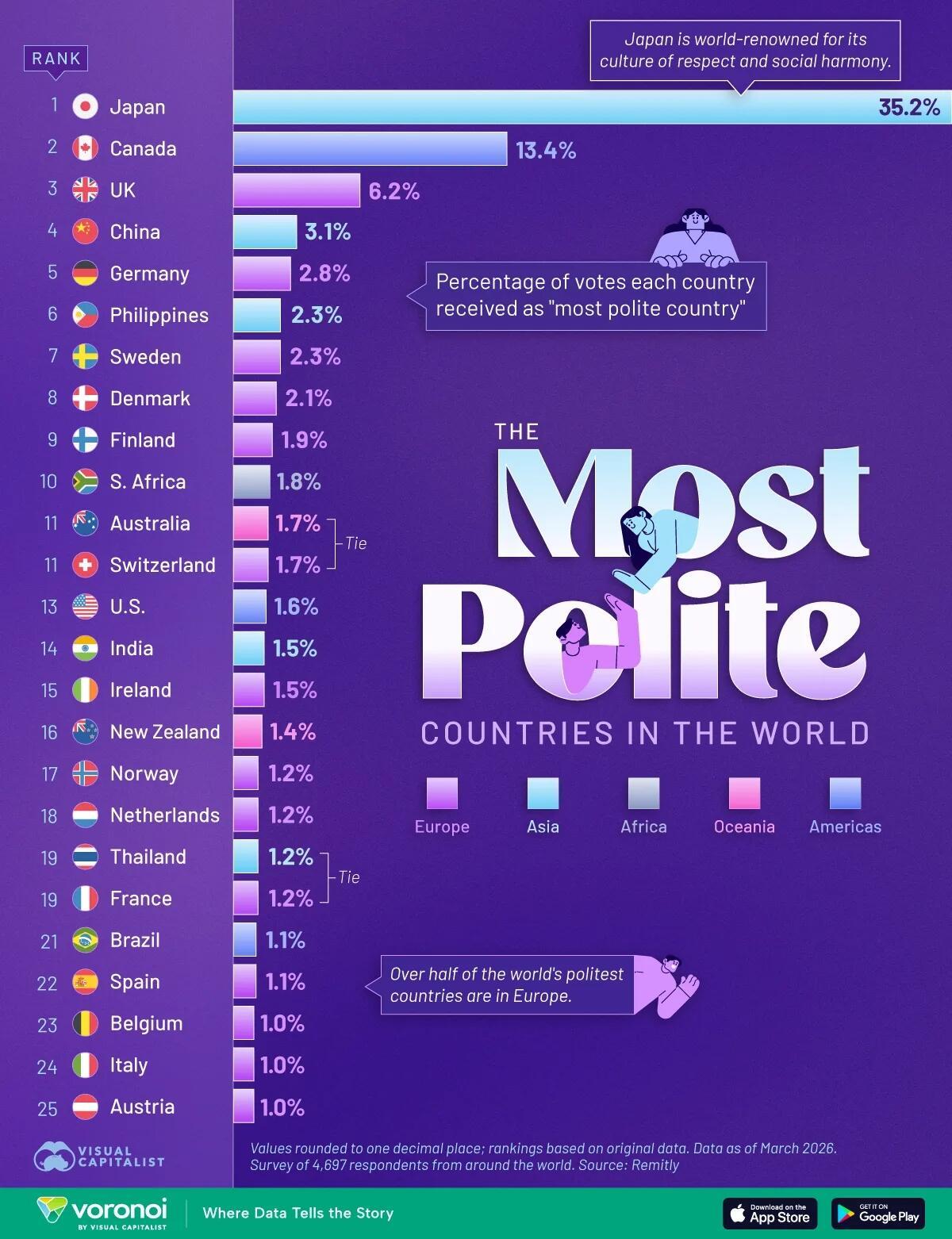 After Canada, the United Kingdom ranks third at 6.2%, leading a strong European showing. In total, European countries make up more than half of the top 25—suggesting that politeness, as perceived globally, is strongly associated with the region.